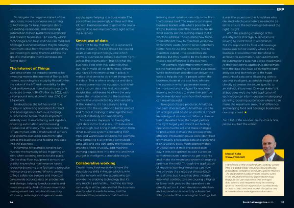 With the pressing challenge of the industry labor shortage , businesses are looking to invest more in automation . But it ’ s important for food and beverage businesses to first identify where in the business it would be most beneficial to achieve this automation , with automation for automation ’ s sake not a wise investment . At the heart of this approach is doing more with the data you have , applying the right analytics and technology to the huge amounts of data we ’ re all dealing with to uncover intelligent , actionable insight that directly addresses the issues specific to an individual business . One size doesn ’ t fit all but done well , the right application of technology can inform decision-making and planning , boosting automation where it can make the maximum amount of difference and keeping food and beverage businesses one step ahead . ■