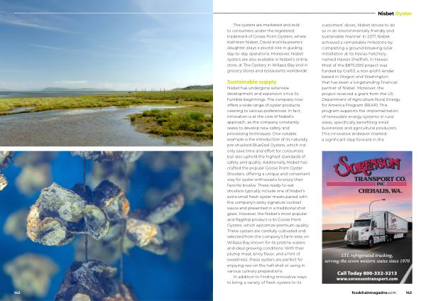 In addition to finding innovative ways to bring a variety of fresh oysters to its customers ’ doors , Nisbet strives to do so in an environmentally friendly and sustainable manner . In 2017 , Nisbet achieved a remarkable milestone by completing a ground-breaking solar installation at its Kea ’ au hatchery , named Hawaii Shellfish , in Hawaii . Most of the $ 875,000 project was funded by Craft3 , a non-profit lender based in Oregon and Washington that has been a longstanding financial partner of Nisbet . Moreover , the project received a grant from the US Department of Agriculture Rural Energy for America Program ( REAP ). This program supports the implementation of renewable energy systems in rural areas , specifically benefiting small businesses and agricultural producers . This innovative endeavor marked a significant step forward in the foodchainmagazine . com 143