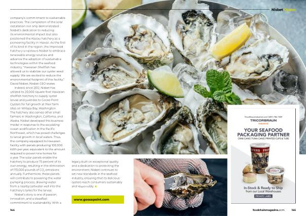 company ’ s commitment to sustainable practices . The completion of the solar installation not only demonstrated Nisbet ’ s dedication to reducing its environmental impact but also positioned the Kea ’ au hatchery as a pioneering facility in Hawaii . As the first of its kind in the region , the improved hatchery empowers Nisbet to embrace renewable energy sources and advance the adoption of sustainable technologies within the seafood industry . “ Hawaiian Shellfish has allowed us to stabilize our oyster seed supply . We are excited to reduce the environmental footprint of this facility ,” David Nisbet , Nisbet CEO states .