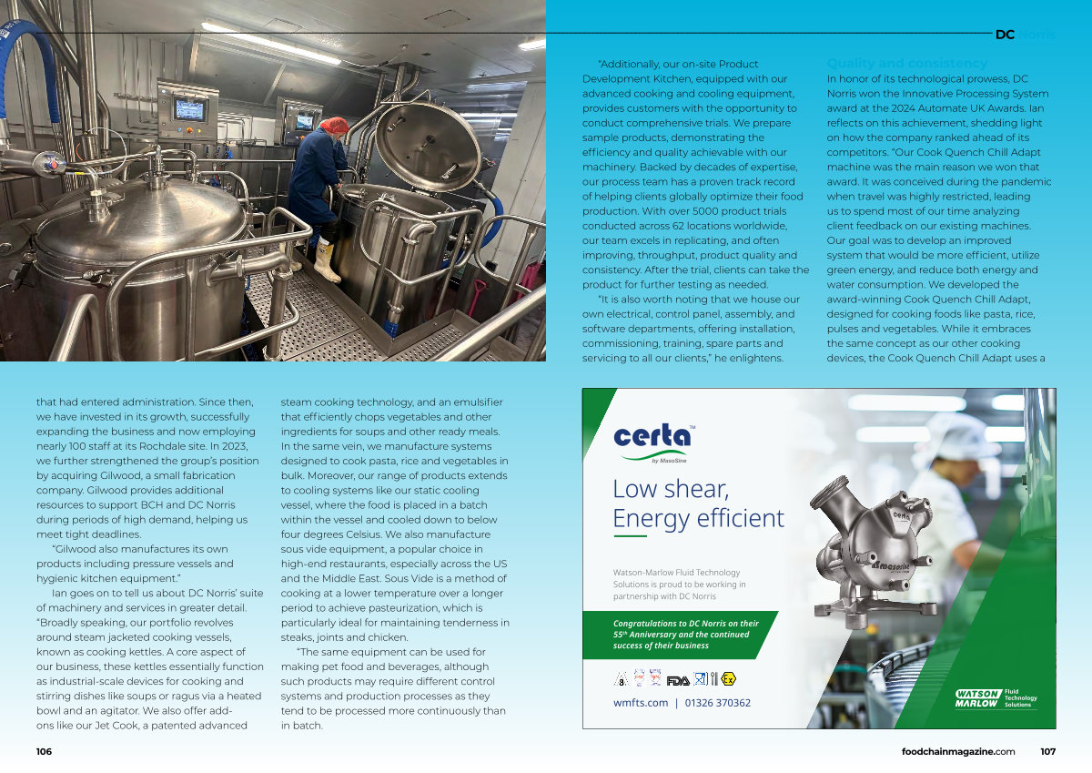 In honor of its technological prowess , DC Norris won the Innovative Processing System award at the 2024 Automate UK Awards . Ian reflects on this achievement , shedding light on how the company ranked ahead of its competitors . “ Our Cook Quench Chill Adapt machine was the main reason we won that award . It was conceived during the pandemic when travel was highly restricted , leading us to spend most of our time analyzing client feedback on our existing machines . Our goal was to develop an improved system that would be more efficient , utilize green energy , and reduce both energy and water consumption . We developed the award-winning Cook Quench Chill Adapt , designed for cooking foods like pasta , rice , pulses and vegetables . While it embraces the same concept as our other cooking devices , the Cook Quench Chill Adapt uses a