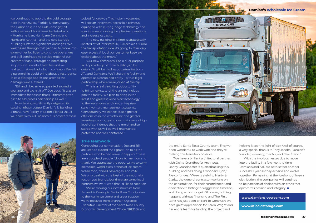 Concluding our conversation , Joe and Bill are keen to extend their gratitude to all the partners who helped make it happen . “ There are a couple of people I ’ d love to mention and thank . We appreciate the opportunity to carry incredible , world-class brands of ice cream , frozen food , chilled beverages , and milk . We only deal with the best of the nationally recognized brands , but there are some local partners we work with that I ’ d like to mention . “ We ’ re moving our infrastructure from Escambia County to Santa Rosa County , due to the warm welcome and great support we ’ ve received from Shannon Ogletree , Executive Director of the Santa Rosa County Economic Development Office ( SREDO ), and