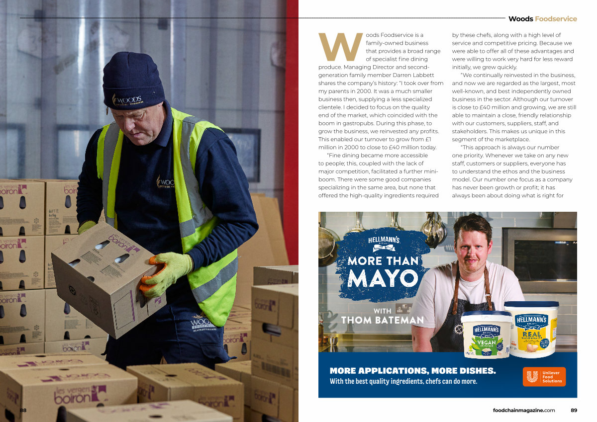 Woods Foodservice is a family-owned business that provides a broad range of specialist fine dining produce . Managing Director and secondgeneration family member Darren Labbett shares the company ’ s history : “ I took over from my parents in 2000 . It was a much smaller business then , supplying a less specialized clientele . I decided to focus on the quality end of the market , which coincided with the boom in gastropubs . During this phase , to grow the business , we reinvested any profits . This enabled our turnover to grow from £ 1 million in 2000 to close to £ 40 million today .