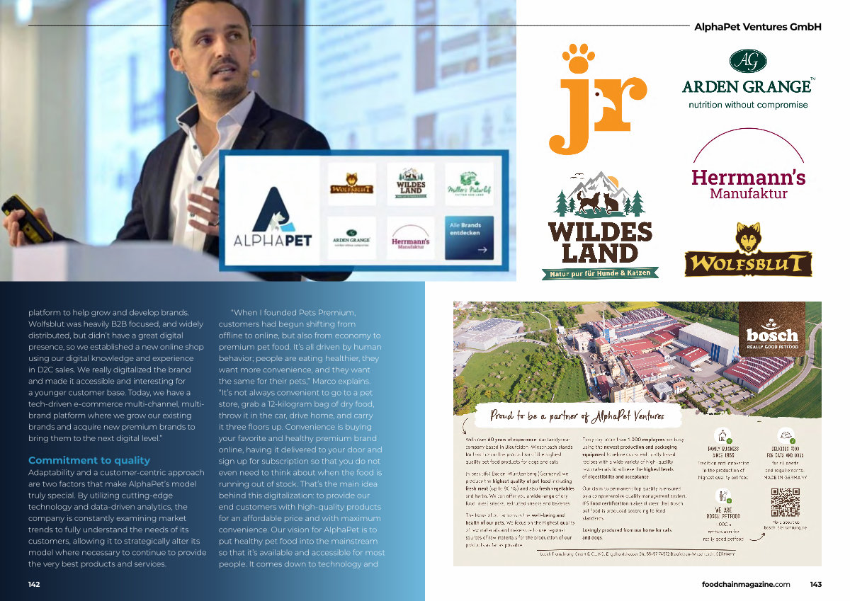 platform to help grow and develop brands. Wolfsblut was heavily B2B focused, and widely distributed, but didn’ t have a great digital presence, so we established a new online shop using our digital knowledge and experience in D2C sales. We really digitalized the brand and made it accessible and interesting for a younger customer base. Today, we have a tech-driven e-commerce multi-channel, multibrand platform where we grow our existing brands and acquire new premium brands to bring them to the next digital level.”