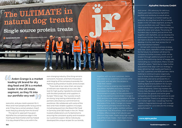 together with our end customers. We’ re very close to our customers; we know what they want, and we tailor the recipes to meet their needs.” When it comes to scoping new brands for acquisition, AlphaPet exclusively chooses businesses that operate in line with this commitment to quality. Its first acquisition in the UK, the premium brand Arden Grange in 2022, and the most recent acquisition of JR Pet Products( JR) back in January 2025 are perfect examples of this. Arden Grange is a market leading brand, primarily known for its dry dog food and high-quality nutrition without compromise. The JR business, which is based in Wales, offers a range of all-natural super premium dog treats. Made using high-quality cuts of the finest meats – from beef, chicken and pork to more exotic options like ostrich and camel – JR’ s advocacy for delicious, healthy pet treats enhances AlphaPet’ s portfolio and reinforces its overall ethos.