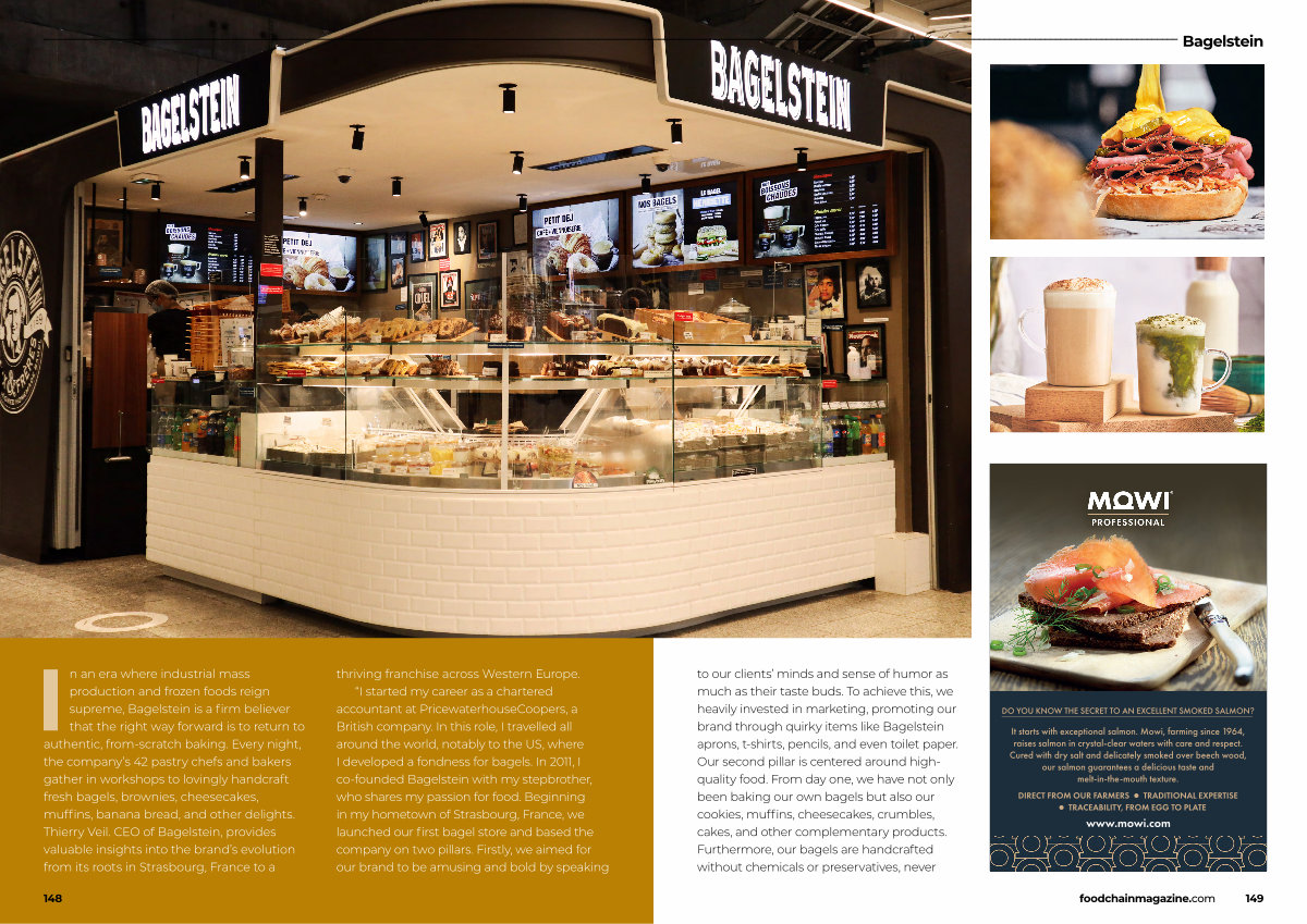 to our clients’ minds and sense of humor as much as their taste buds. To achieve this, we heavily invested in marketing, promoting our brand through quirky items like Bagelstein aprons, t-shirts, pencils, and even toilet paper. Our second pillar is centered around highquality food. From day one, we have not only been baking our own bagels but also our cookies, muffins, cheesecakes, crumbles, cakes, and other complementary products. Furthermore, our bagels are handcrafted without chemicals or preservatives, never