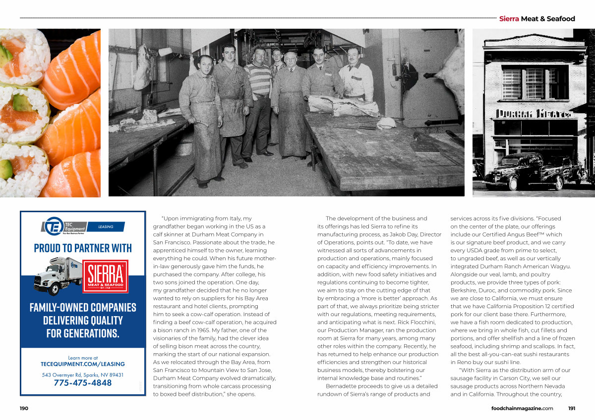 “ Upon immigrating from Italy, my grandfather began working in the US as a calf skinner at Durham Meat Company in San Francisco. Passionate about the trade, he apprenticed himself to the owner, learning everything he could. When his future motherin-law generously gave him the funds, he purchased the company. After college, his two sons joined the operation. One day, my grandfather decided that he no longer wanted to rely on suppliers for his Bay Area restaurant and hotel clients, prompting him to seek a cow-calf operation. Instead of finding a beef cow-calf operation, he acquired a bison ranch in 1965. My father, one of the visionaries of the family, had the clever idea of selling bison meat across the country, marking the start of our national expansion. As we relocated through the Bay Area, from San Francisco to Mountain View to San Jose, Durham Meat Company evolved dramatically, transitioning from whole carcass processing to boxed beef distribution,” she opens.