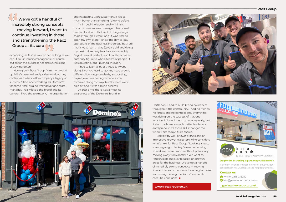 Backed by well-known brands and an impressive growth trajectory, Mike considers what’ s next for Racz Group:“ Looking ahead, scale is going to be key. We’ re not looking to add any more brands without potentially moving away from another. We want to remain lean and stay focused on growth areas for the business. We’ ve got a handful of incredibly strong concepts— moving forward, I want to continue investing in those and strengthening the Racz Group at its core,” he concludes. ■