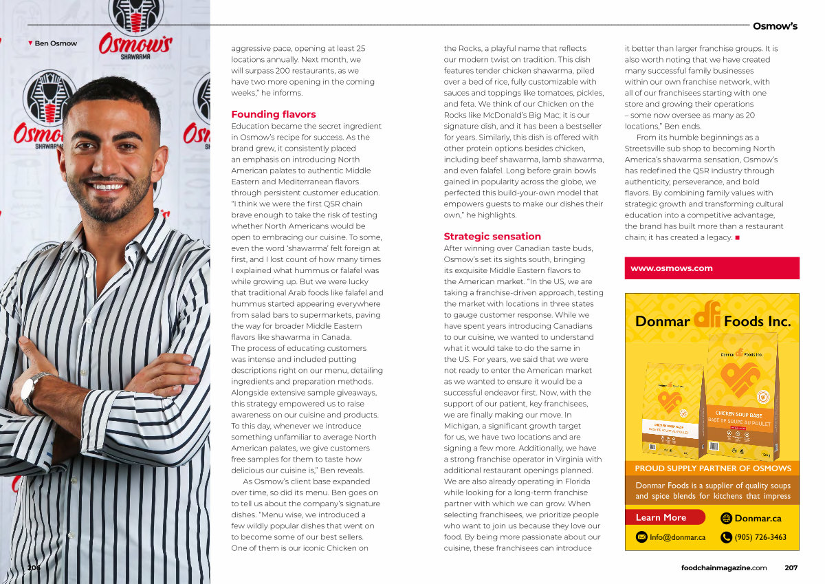 From its humble beginnings as a Streetsville sub shop to becoming North America’ s shawarma sensation, Osmow’ s has redefined the QSR industry through authenticity, perseverance, and bold flavors. By combining family values with strategic growth and transforming cultural education into a competitive advantage, the brand has built more than a restaurant chain; it has created a legacy. ■