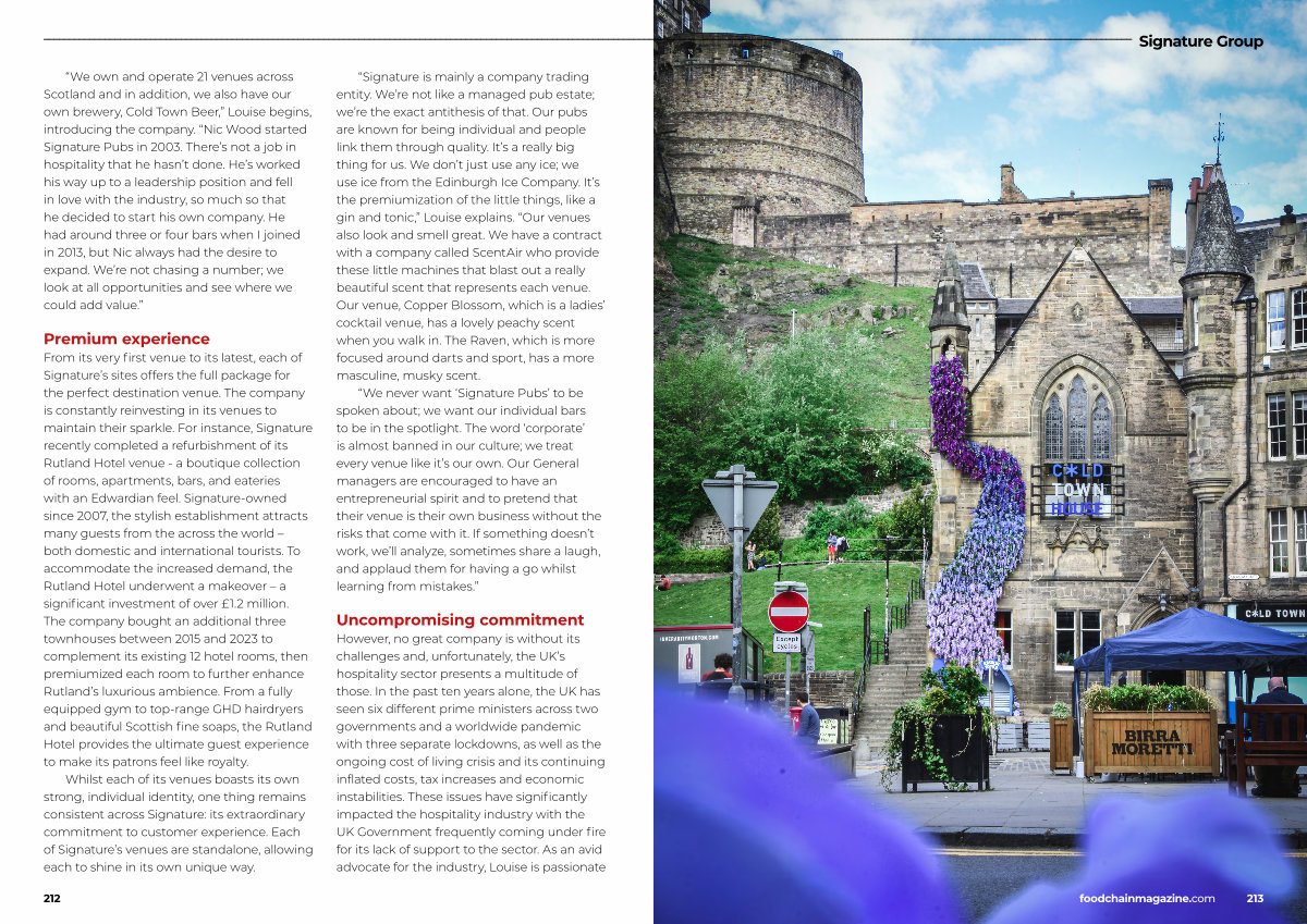 “ We own and operate 21 venues across Scotland and in addition, we also have our own brewery, Cold Town Beer,” Louise begins, introducing the company.“ Nic Wood started Signature Pubs in 2003. There’ s not a job in hospitality that he hasn’ t done. He’ s worked his way up to a leadership position and fell in love with the industry, so much so that he decided to start his own company. He had around three or four bars when I joined in 2013, but Nic always had the desire to expand. We’ re not chasing a number; we look at all opportunities and see where we could add value.”