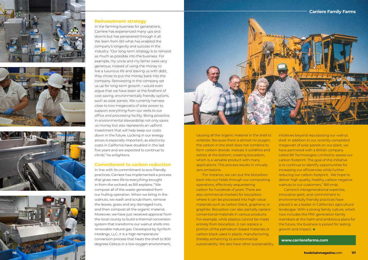 “ For instance, we can put the biocarbon back into our fields through our composting operations, effectively sequestering carbon for hundreds of years. There are also commercial markets for biocarbon, where it can be processed into high-value materials such as carbon black, graphene, or graphite. Biocarbon can also partially replace conventional materials in various products. For example, while plastics cannot be made entirely from biocarbon, it can replace a portion of the petroleum-based materials or carbon black used in plastic manufacturing, thereby enhancing its environmental sustainability. We also have other sustainability initiatives beyond repurposing our walnut shell. In addition to our recently completed megawatt of solar panels on our plant, we have partnered with a British company called BX Technologies Limited to assess our carbon footprint. The goal of this initiative is to continue to identify opportunities for increasing our efficiencies while further reducing our carbon footprint. We hope to deliver high quality, healthy, carbon negative walnuts to our customers,” Bill ends.