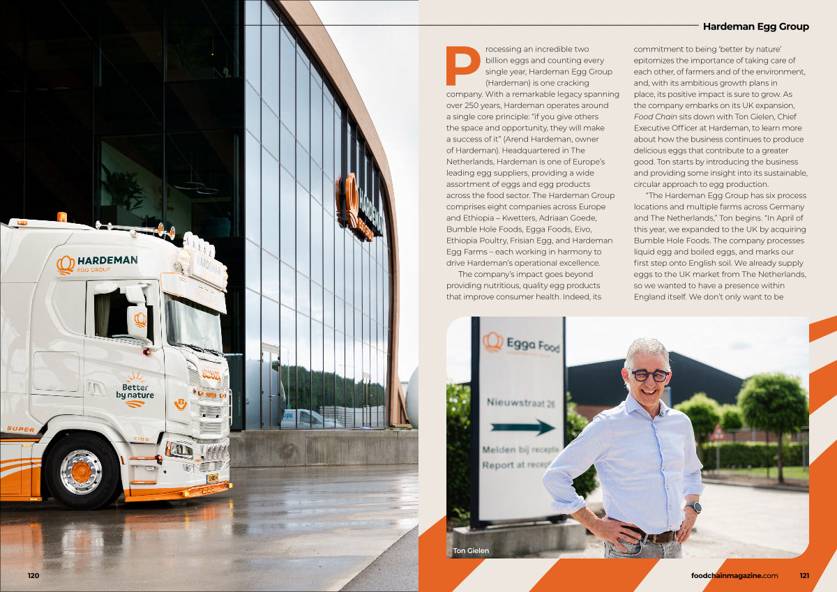 Processing an incredible two billion eggs and counting every single year, Hardeman Egg Group( Hardeman) is one cracking company. With a remarkable legacy spanning over 250 years, Hardeman operates around a single core principle:“ if you give others the space and opportunity, they will make a success of it”( Arend Hardeman, owner of Hardeman). Headquartered in The Netherlands, Hardeman is one of Europe’ s leading egg suppliers, providing a wide assortment of eggs and egg products across the food sector. The Hardeman Group comprises eight companies across Europe and Ethiopia – Kwetters, Adriaan Goede, Bumble Hole Foods, Egga Foods, Eivo, Ethiopia Poultry, Frisian Egg, and Hardeman Egg Farms – each working in harmony to drive Hardeman’ s operational excellence. The company’ s impact goes beyond providing nutritious, quality egg products that improve consumer health. Indeed, its commitment to being‘ better by nature’ epitomizes the importance of taking care of each other, of farmers and of the environment, and, with its ambitious growth plans in place, its positive impact is sure to grow. As the company embarks on its UK expansion, Food Chain sits down with Ton Gielen, Chief Executive Officer at Hardeman, to learn more about how the business continues to produce delicious eggs that contribute to a greater good. Ton starts by introducing the business and providing some insight into its sustainable, circular approach to egg production.