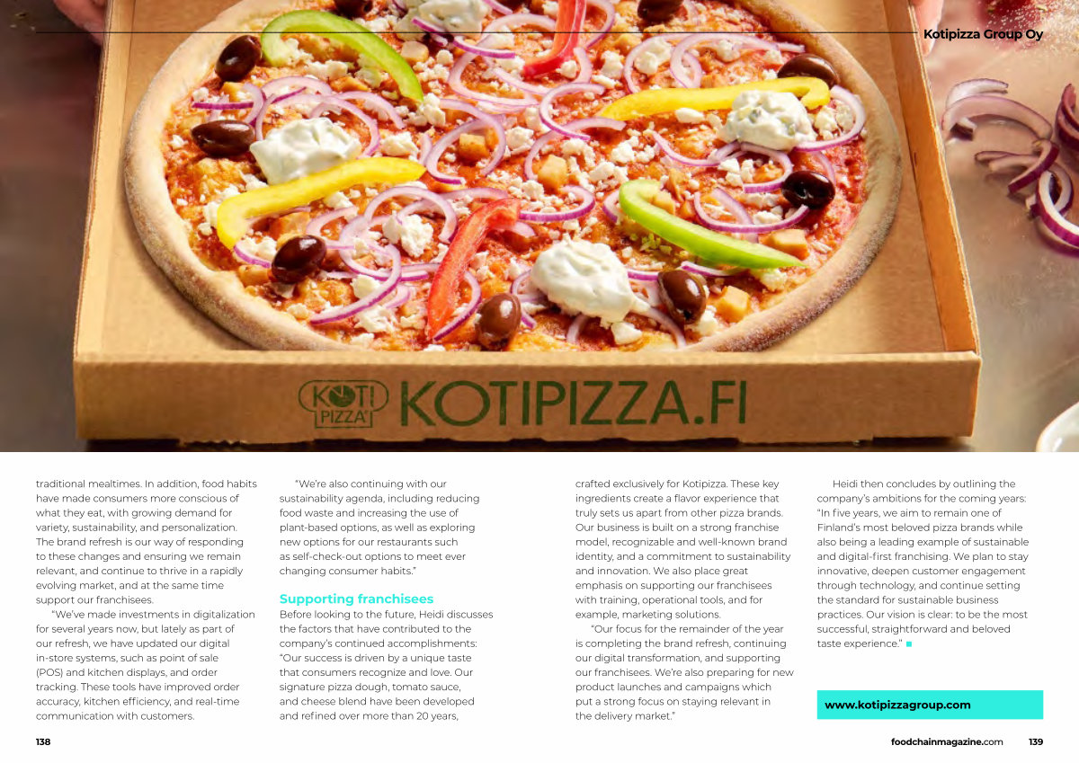 Heidi then concludes by outlining the company’ s ambitions for the coming years:“ In five years, we aim to remain one of Finland’ s most beloved pizza brands while also being a leading example of sustainable and digital-first franchising. We plan to stay innovative, deepen customer engagement through technology, and continue setting the standard for sustainable business practices. Our vision is clear: to be the most successful, straightforward and beloved taste experience.” ■