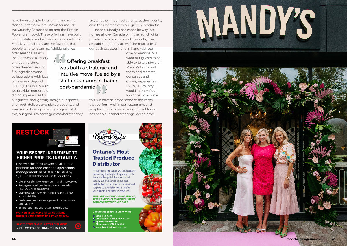 have been a staple for a long time. Some standout items we are known for include the Crunchy Sesame salad and the Protein Power grain bowl. These offerings have built our reputation and are synonymous with the Mandy’ s brand; they are the favorites that people tend to return to. Additionally, we offer seasonal salads that showcase a variety of global cuisines, often themed around fun ingredients and collaborations with local companies. Beyond crafting delicious salads, we provide memorable dining experiences for our guests, thoughtfully design our spaces, offer both delivery and pickup options, and even run a thriving catering program. With this, our goal is to meet guests wherever they are, whether in our restaurants, at their events, or in their homes with our grocery products.” Indeed, Mandy’ s has made its way into homes all over Canada with the launch of its private label dressings and products, now available in grocery aisles.“ The retail side of our business goes hand in hand with our
