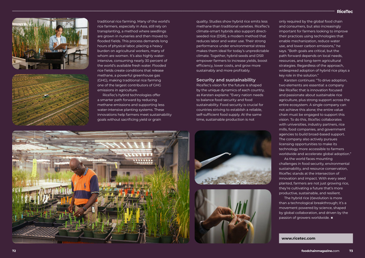 RiceTec’ s vision for the future is shaped by the unique dynamics of each country, as Karsten explains:“ Every nation needs to balance food security and food sustainability. Food security is crucial for countries striving to establish a reliable, self-sufficient food supply. At the same time, sustainable production is not only required by the global food chain and consumers, but also increasingly important for farmers looking to improve their practices using technologies that enable mechanization, reduce water use, and lower carbon emissions,” he says.“ Both goals are critical, but the path forward depends on local needs, resources, and long-term agricultural strategies. Regardless of the approach, widespread adoption of hybrid rice plays a key role in the solution.”