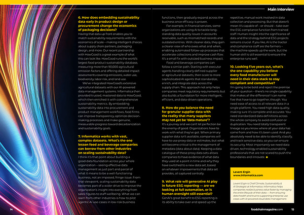 10. Looking five years out, what’ s the one capability you believe every food manufacturer will need in their data stack to stay compliant and competitive? I’ m going to be bold and reject the premise of your question – there’ s no single capability that makes all the difference! I can name five that have to go together, though. You need ease of access to all relevant data in a single platform. You need high data quality, making sure it’ s complete and accurate. You need standardized data definitions across the whole company to avoid confusion or duplication. You need totally transparent lineage so you know where all your data has come from and how it’ s been used. And you absolutely need to be able to identify, classify, and track sensitive data, so you can ensure its security. Most importantly we need data driven, technology enabled sustainability professionals that are not scared to push the boundaries and innovate. ■
