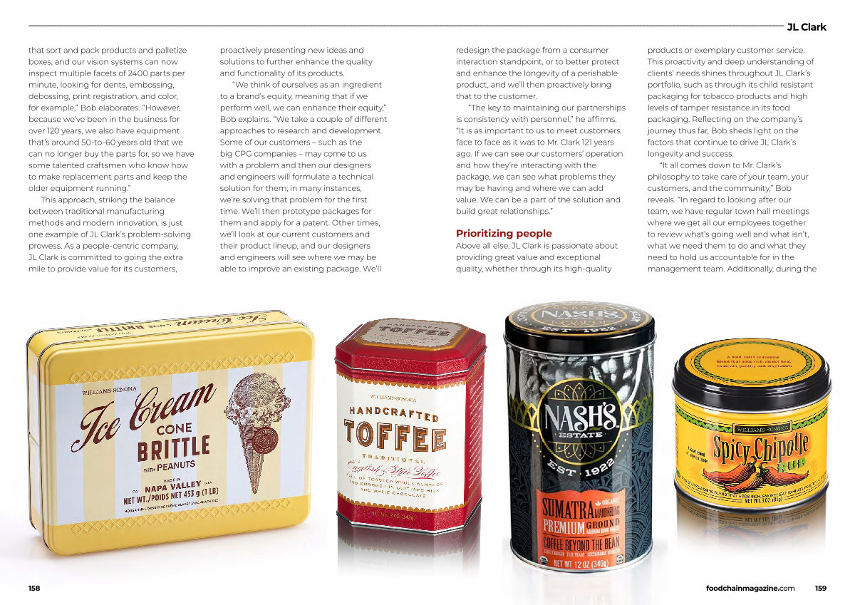 Above all else, JL Clark is passionate about providing great value and exceptional quality, whether through its high-quality products or exemplary customer service. This proactivity and deep understanding of clients’ needs shines throughout JL Clark’ s portfolio, such as through its child resistant packaging for tobacco products and high levels of tamper resistance in its food packaging. Reflecting on the company’ s journey thus far, Bob sheds light on the factors that continue to drive JL Clark’ s longevity and success.