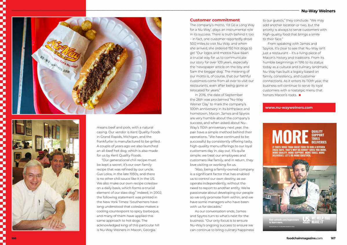 “ Our generational chili recipe must be kept a secret; it’ s our own family recipe that was refined by our uncle, Gus Lolos, in the late 1930s, and there is no other chili sauce like it in the US. We also make our own-recipe coleslaw on a daily basis, which forms a crucial element of our slaw dog.” Indeed, in 2002, the following statement was printed in the New York Times:‘ Southerners have long understood that coleslaw makes a cooling counterpoint to spicy barbeque, and many of them have applied this same approach to hot dogs. The acknowledged king of this particular hill is Nu-Way Weiners in Macon, Georgia.’