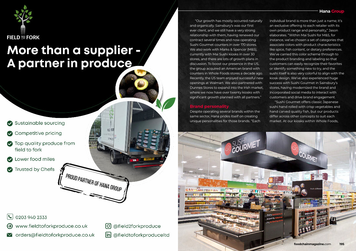 Despite operating several brands within the same sector, Hana prides itself on creating unique personalities for those brands.“ Each individual brand is more than just a name; it’ s an exclusive offering to each retailer with its own product range and personality,” Jason elaborates.“ Within Mai Sushi for M & S, for instance, we’ ve chosen a set of categories that associate colors with product characteristics like spice, fish content, or dietary preferences. We’ ve carried this color scheme through to the product branding and labeling so that customers can easily recognize their favorites or identify something new to try, and the sushi itself is also very colorful to align with the kiosk design. We’ ve also experienced huge success with Sushi Gourmet in Sainsbury’ s stores, having modernized the brand and incorporated social media to interact with customers and drive brand engagement.