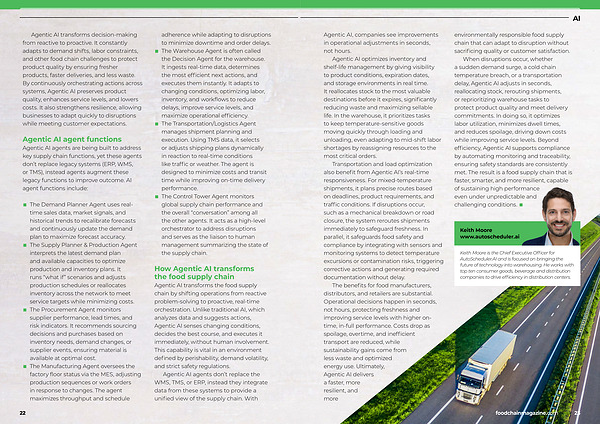 When disruptions occur, whether a sudden demand surge, a cold chain temperature breach, or a transportation delay, Agentic AI adjusts in seconds, reallocating stock, rerouting shipments, or reprioritizing warehouse tasks to protect product quality and meet delivery commitments. In doing so, it optimizes labor utilization, minimizes dwell times, and reduces spoilage, driving down costs while improving service levels. Beyond efficiency, Agentic AI supports compliance by automating monitoring and traceability, ensuring safety standards are consistently met. The result is a food supply chain that is faster, smarter, and more resilient, capable of sustaining high performance even under unpredictable and challenging conditions. ■