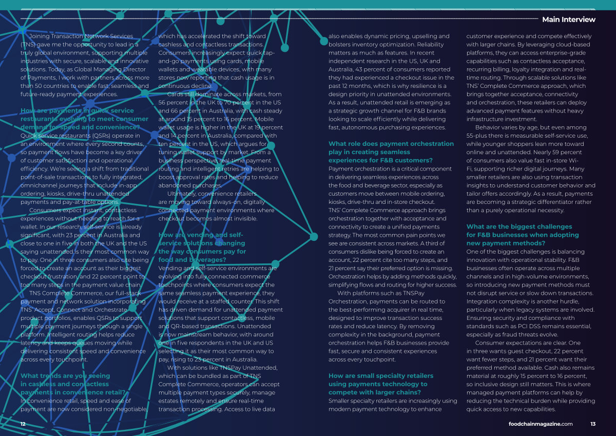 What role does payment orchestration play in creating seamless experiences for F & B customers? Payment orchestration is a critical component in delivering seamless experiences across the food and beverage sector, especially as customers move between mobile ordering, kiosks, drive-thru and in-store checkout. TNS’ Complete Commerce approach brings orchestration together with acceptance and connectivity to create a unified payments strategy. The most common pain points we see are consistent across markets. A third of consumers dislike being forced to create an account, 22 percent cite too many steps, and 21 percent say their preferred option is missing. Orchestration helps by adding methods quickly, simplifying flows and routing for higher success.