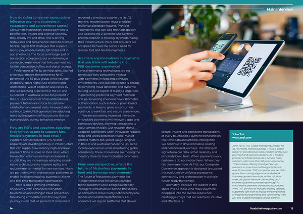 How are PSPs and acquirers adapting their infrastructure to support fast, flexible payments in food retail? Payment service providers( PSPs) and acquirers are investing heavily in infrastructure that can support low-latency, high-approval payment flows at scale. In food retail, where transaction volumes are high and speed is crucial, they are increasingly adopting cloudnative architectures to improve agility and reduce time-to-market for new services. Many are partnering with orchestration platforms to enable intelligent routing, automatic failover and real-time transaction optimization. There is also a growing emphasis on security, with enhanced encryption, tokenization and stronger fraud prevention tools being embedded into the payment journey. Given that 43 percent of consumers reported a checkout issue in the last 12 months, modernization must prioritize resilience alongside features. Provider ecosystems that can add methods quickly also address the 21 percent who say their preferred option is missing. By modernizing their infrastructure, PSPs and acquirers are equipped to meet the sector’ s need for reliable, fast and flexible payments.