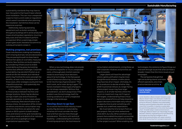Carrie Woehler is Black & Veatch Solutions Lead. Black & Veatch helps manufacturers modernize facilities and energy systems with solutions that enhance efficiency, reliability and sustainability. Feeding a growing global population demands more than innovation; it requires a sustainable, forward-thinking approach to the entire food supply chain. To tackle today’ s needs and tomorrow’ s challenges, Black & Veatch can help bridge the gap between research, engineering and manufacturing, by bringing new food technologies to life or optimizing existing facilities with expert solutions that derisk the journey from concept to execution.