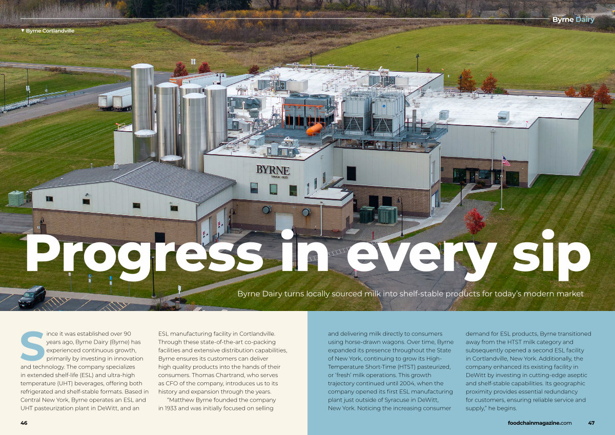 Since it was established over 90 years ago, Byrne Dairy( Byrne) has experienced continuous growth, primarily by investing in innovation and technology. The company specializes in extended shelf-life( ESL) and ultra-high temperature( UHT) beverages, offering both refrigerated and shelf-stable formats. Based in Central New York, Byrne operates an ESL and UHT pasteurization plant in DeWitt, and an