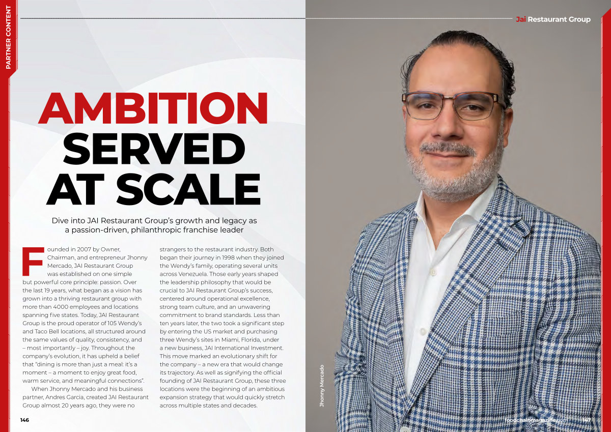 When Jhonny Mercado and his business partner, Andres Garcia, created JAI Restaurant Group almost 20 years ago, they were no strangers to the restaurant industry. Both began their journey in 1998 when they joined the Wendy’ s family, operating several units across Venezuela. Those early years shaped the leadership philosophy that would be crucial to JAI Restaurant Group’ s success, centered around operational excellence, strong team culture, and an unwavering commitment to brand standards. Less than ten years later, the two took a significant step by entering the US market and purchasing three Wendy’ s sites in Miami, Florida, under a new business, JAI International Investment. This move marked an evolutionary shift for the company – a new era that would change its trajectory. As well as signifying the official founding of JAI Restaurant Group, these three locations were the beginning of an ambitious expansion strategy that would quickly stretch across multiple states and decades.